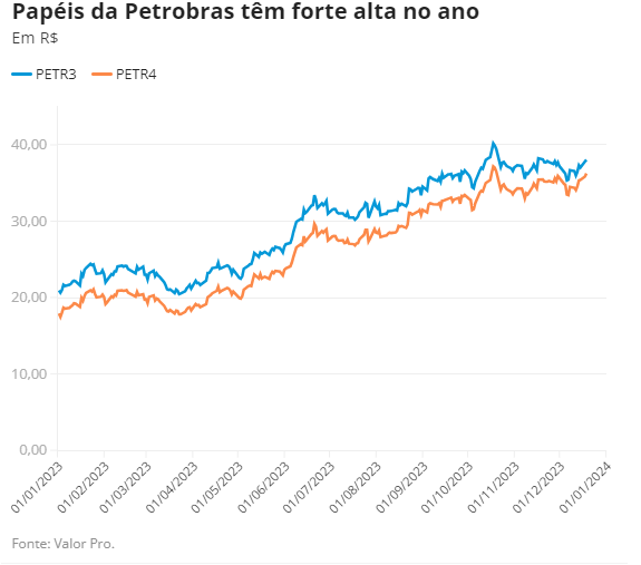 No ano, PETR3 sobe 69,57% e PETR4 avança 89,27%. Os papéis fecharam o pregão de ontem negociados a R$ 38,04 e R$ 36,25, respectivamente.