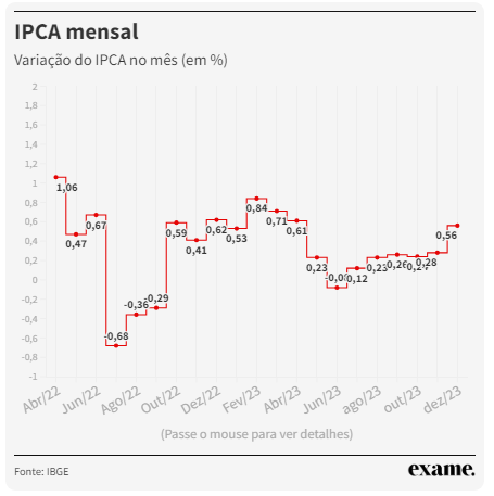 O Índice Nacional de Preços ao Consumidor (IPCA), indicador que é a inflação oficial do Brasil, fechou o mês de dezembro de 2023 com alta de 0,56%, após registrar avanço de 0,28% em novembro. O resultado foi divulgado nesta quinta-feira, 11, pelo Instituto Brasileiro de Geografia e Estatística (IBGE). Com isso, o IPCA acumulou alta de 4,62% em 2023, dentro da meta de inflação que vai até 4,75%.