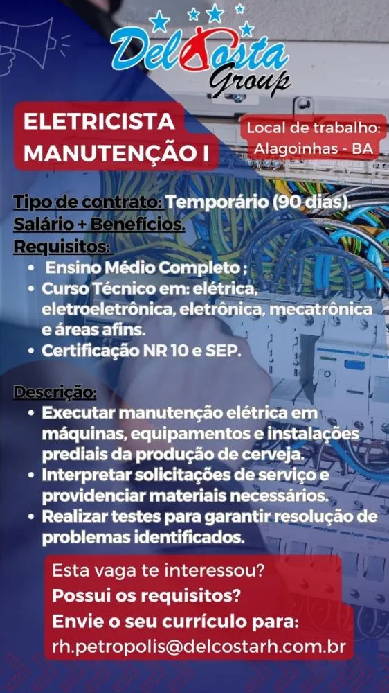 Alagoinhas: empresa contrata eletricista em manutenção I