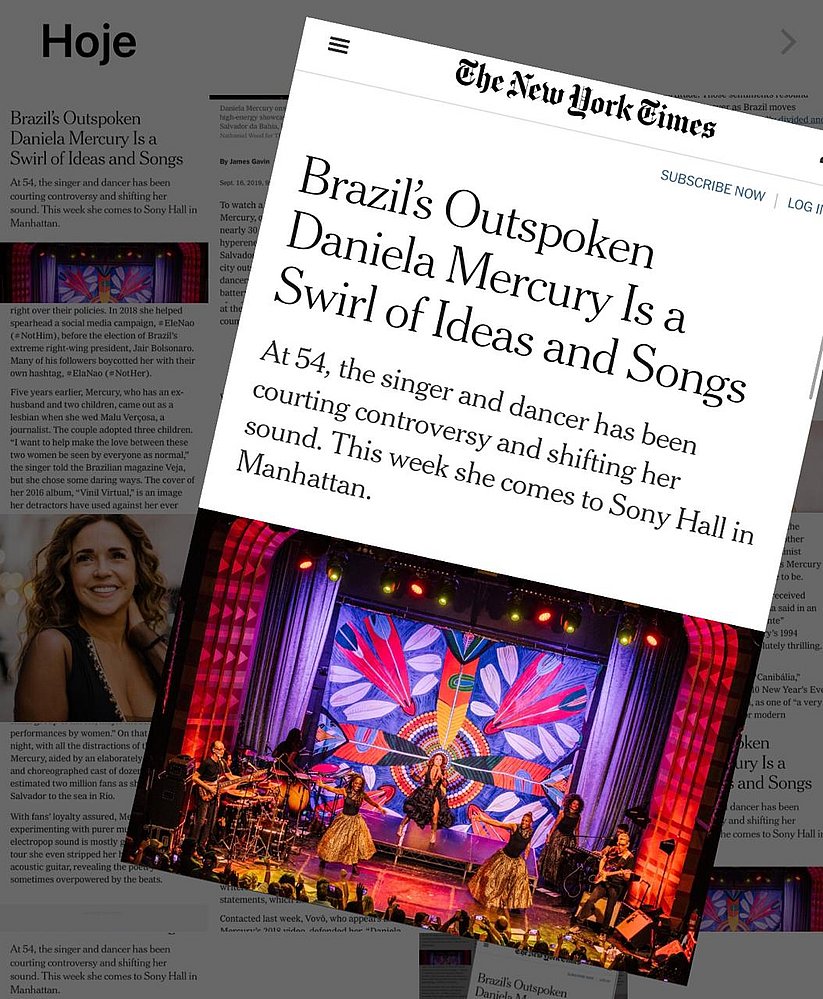 Com título "Daniela Mercury, a brasileira franca, é um turbilhão de ideias e músicas", a matéria publicada nesta segunda-feira (16) foi escrita pelo jornalista James Gavin e divulga um show que a cantora baiana fará no Sony Hall, no distrito de Manhattan, em Nova York.