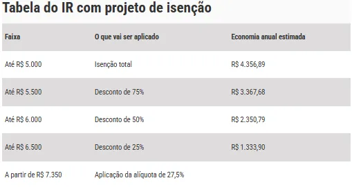 A proposta não beneficia apenas quem recebe até R$ 5 mil. No texto original do governo, já estava prevista uma faixa de descontos no IR para rendas de até R$ 7 mil. Contudo, após a revisão do relator na Câmara, deputado Arthur Lira (PP-AL), a isenção parcial foi ampliada para quem ganha até R$ 7.350.