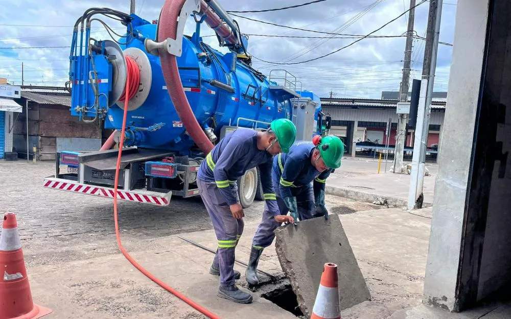 No centro da cidade, o serviço de drenagem contou com o apoio de caminhão hidrovácuo, equipamento utilizado para sucção e desobstrução das redes de esgoto, a fim de minimizar os impactos provocados pelo acúmulo de água.