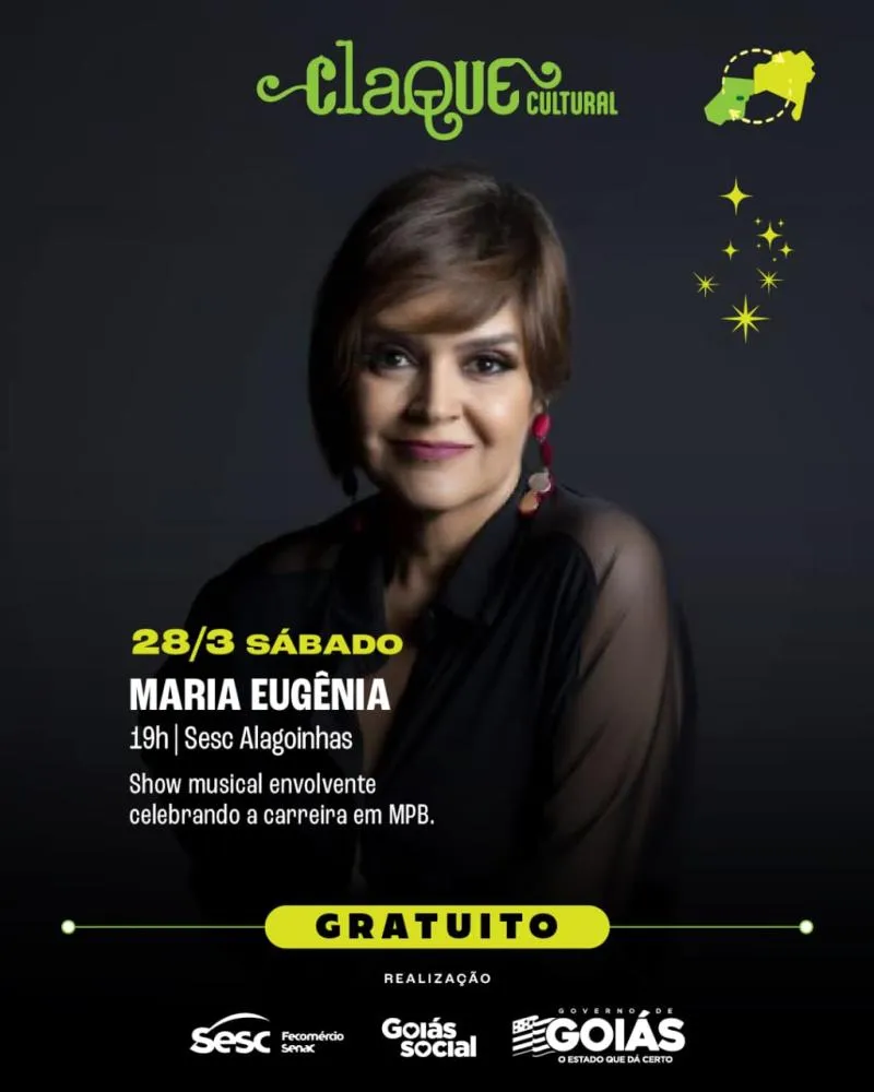 No sábado, é a vez da cantora Maria Eugênia, um dos nomes consolidados da música goiana, subir ao palco com o show “Maria Eugênia”. Com mais de 30 anos de carreira, a artista já se apresentou em mais de 20 países e possui mais de 20 CDs gravados. Em Alagoinhas, o público poderá acompanhar um repertório que passeia por clássicos da Música Popular Brasileira.
