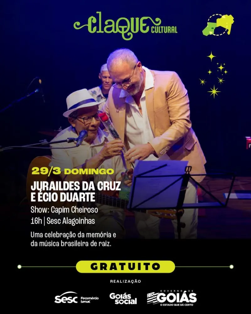 Encerrando a programação no domingo, o projeto apresenta o show “Capim Cheiroso”, que reúne 13 canções selecionadas para representar a trajetória de dois músicos goianos que compartilham experiências e influências desde a década de 1980, reafirmando conexões com a música popular brasileira.