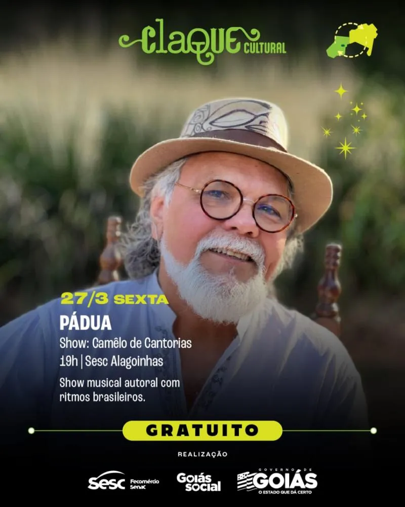 A programação segue agora com uma série de shows musicais no Teatro Sesc Alagoinhas, com acesso gratuito ao público. As apresentações começam na sexta-feira (sexta-feira), com o espetáculo “Camelô de Cantorias”, do artista Pádua, que traz ao palco uma mistura de influências musicais como samba, choro, coco, xote e baladas, explorando diferentes linguagens e ritmos em sua performance como compositor e intérprete.